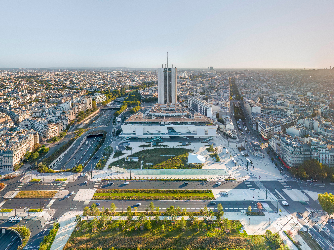 « Le futur axe majeur de la Porte Maillot est repensé pour répondre aux attentes de la ville de demain : Une ville végétalisée, réduisant la place de la voiture en favorisant les mobilités douces et les transports en commun. »